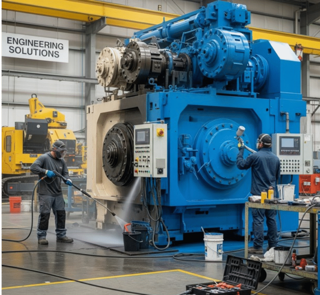 - Machines are thoroughly cleaned using industrial-grade methods to remove dust, grease, and residues.
